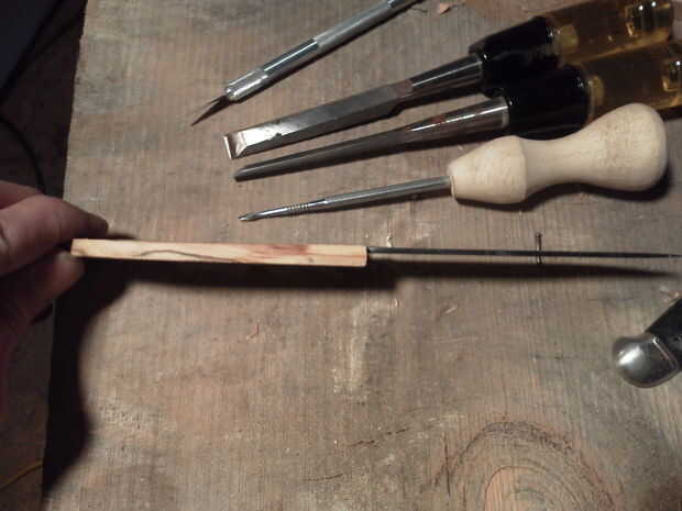 usé una variedad de cinceles y mi fiel taladro lijadora para tallar hacia fuera de la manija para que la cuchilla se ajusta en plano cuando lo miramos desde el borde trasero. Esto toma bastante tiempo y debe hacerse con mucho cuidado, verificar el ajuste a menudo. Espero que es paciente.