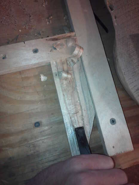 Ahora cortamos un espacio para la lámina... Seguir comprobando el ajuste... ser paciente y cuidadoso y cuando estás cincelando hacia la punta de la vaina, tenga cuidado de no resbalar y gubia hacia fuera el extremo. He jodido un par de cuadras a la mesa de apoyo contra la forma que mis manos detrás de la hoja de cincel.