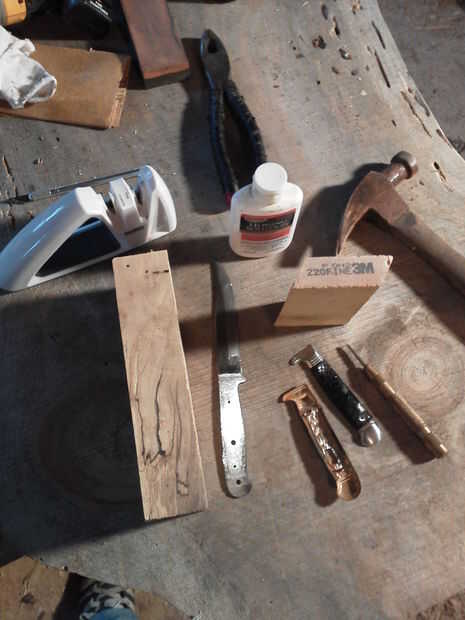 Aquí es la madera que utiliza, una pieza del arce de spalted cerca de 2 "x 3" x 10" de un cuenco torneado en blanco. Encima es mi afilador de cuchillos y algunas otras herramientas que utiliza para eliminar el viejo maneja y limpia la hoja, incluyendo aceite de bruñido.