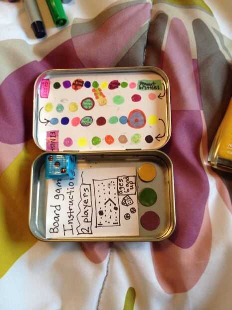 Ahora que todo está hecho, usted puede poner todo dentro de la caja pequeña! Los imanes se pegarán si su caso de Altoids es de metal. También se necesita un dado para jugar. (Como dije al principio, hice este un par de años antes de este tutorial, para no tener todo ya. No pude encontrar la tiza, para que no de en la foto. Pero si lo hiciste correctamente la pintura de pizarra, entonces funcionará como una pizarra. ) también podría querer mantener un pedacito de toalla de papel para un borrador para la pizarra. Ahora el juego ha terminado!