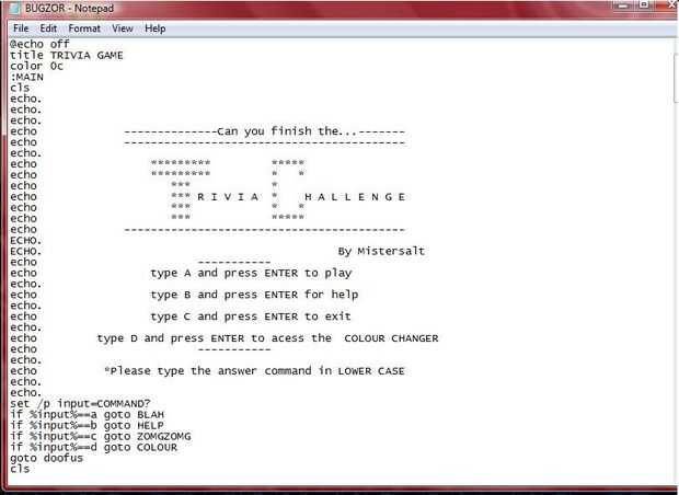 OK, como todos los juegos, tienen un page(menu) principal. Utilice todas sus habilidades de fabricación de cuadros de texto y hace agradable y hermoso. OK, para aquellos que tienen poca habilidad en esta secuencia de comandos por lotes, introduzca este código: