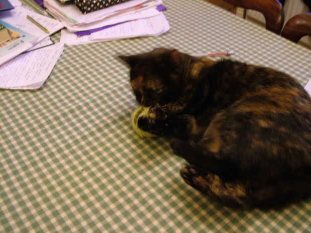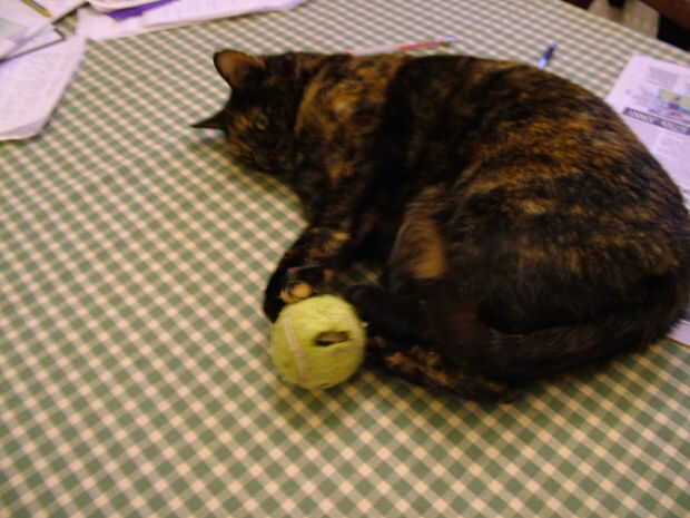 hay algunos juguetes de gato en la casa que son particularmente populares entre los residentes locales.  Son simples esferas huecas con ranuras de corte.  Son grandes para gatitos poner, pequeño y ligero.  Después de mirar fijamente en uno durante un