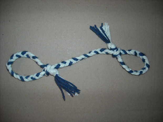 Hice un juguete de perro siguiendo estas instrucciones y pensamiento podría alterar y hacer uno más adecuado para mis perros. Tengo varios Basset que gusta jugar a tira y afloja. El hilo rápidamente destrozado y mis perros tuvieron problemas para agarrar el hilo suelto y nudo en el extremo con la boca pequeña.