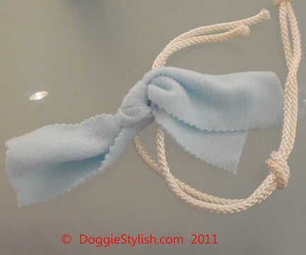 Tomar su tira de forro polar y Átala a la cuerda sobre el último nudo. Una vez que colgué el juguete en la cerca, me quité el paño grueso y suave en la foto, era demasiado corto. Me gusta usar forro polar porque es fuerte cuando está mojado, es elástico y muy resistente a los dientes del cachorro.
