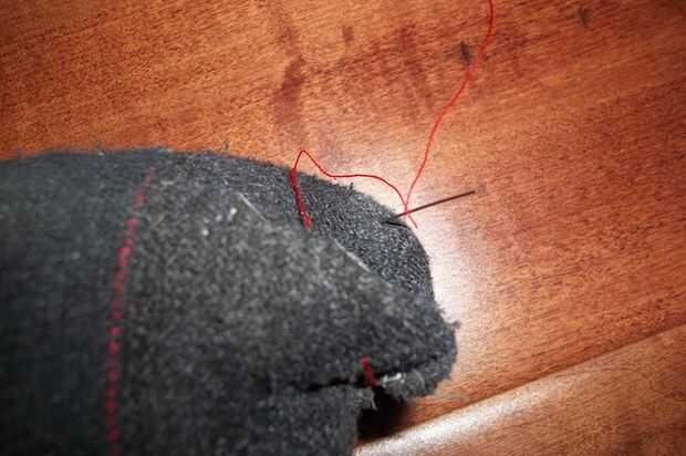 Si el calcetín no tiene ningún agujero, omita este paso. El calcetín que utilicé, lo hicieron me pareció necesario para coser los agujeros. Yo no soy un maestro en la costura, así que improvisó y había cosida arriba con una puntada estándar. No necesitas saber alguna técnica especial.
