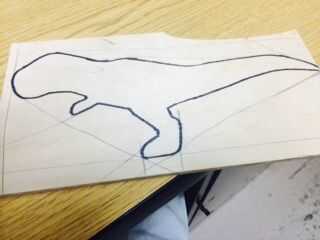 Para este paso usted quiere conseguir ese pedazo de madera de la capa de 1/8". Una vez que han cortado su imagen impresa, seguir adelante y trazar en la pieza delgada de madera de desecho con un rotulador. Al hacer esto que usted quiere asegurarse de que usted "cartoonize" su juguete. Asegúrese de que cuando usted está cortando la plantilla en la Sierra de cinta para no correr nada y para hacer cortes rectos. Aviso en el cuadro que hay líneas dibujadas en lápiz, esas son las líneas que desea tratar y cortar primero. Trate de no hacer demasiados recortes 'la curva'.