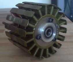 Para hacer el montaje de estator solo, inmóvil, solía los agujeros perforados previamente en las láminas sujete a la superficie de montaje exterior. Los orificios para los tornillos que van todo el camino a través de los estatores serían equivalente, mientras que los agujeros de montaje sería perforado y golpeado ligeramente. Porque esto sería un componente muy estructural, utilicé una redonda gruesa de aleación de aluminio. En el centro de la cara sería un rodamiento del eje para ayudar a apoyar el esfuerzo de torsión de la polea en el extremo. Un cojinete grande presionó sobre el borde exterior de la cara de aluminio para aislar de la poder de giro.
