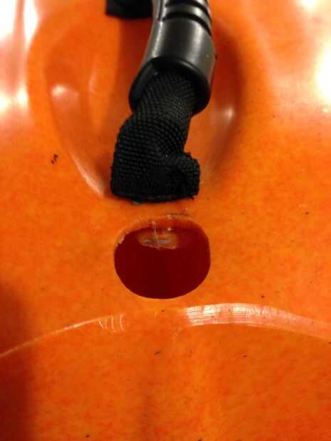Nuevo plan. Ampliado el orificio en el kayak lo suficiente como para permitir que el tubo de desagüe para ajustarse perfectamente al ras con la parte superior del kayak. Para lograr esto que tuve que moler abajo de la cubierta plástica del perno elevador trasero correa (foto). Con el tubo de descarga ahora el tapón de drenaje no sentarse a ras del tubo y el kayak. No pude hacer que no habría espacios en el montaje final.