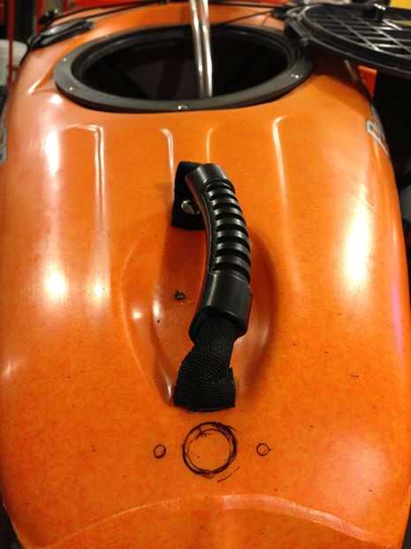 Yo entonces alineado el enchufe en la parte posterior del kayak donde podría conseguirlo para el reborde y luego he marcado con un lápiz. Que utiliza un taladro para los agujeros de remache y mantenga mi Dremel para el enchufe.
