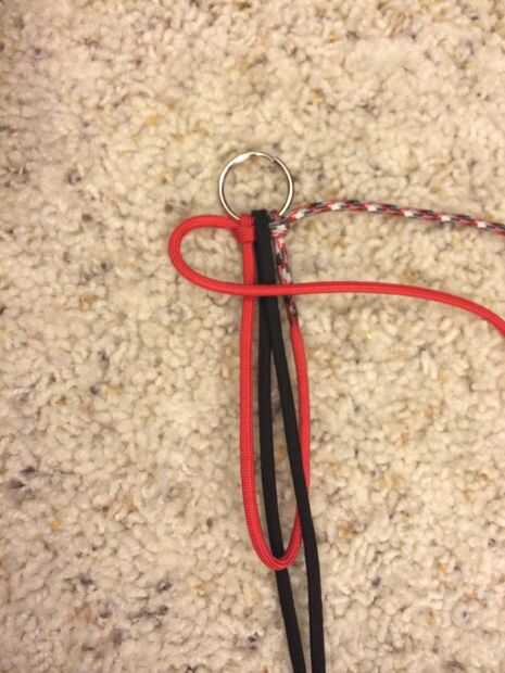 Con una pieza de paracord, ya sea a través del frente horizontal, aproximadamente una pulgada por debajo el aro.