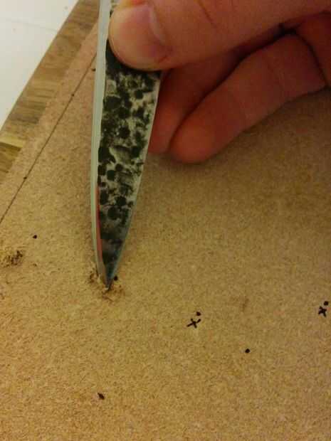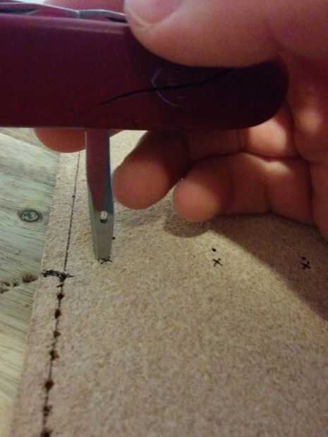 Awl: Empuje la lezna lanzó el cuero, asegúrese de que no hay nada en el otro lado, esto incluye los dedos y tablas de cortar. Si utilizas una navaja suiza necesita girar el punzón para conseguir un agujero redondo.