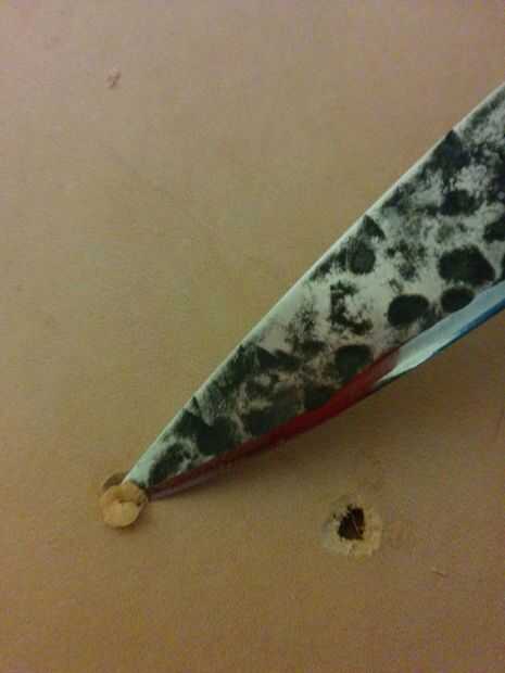 Cuchillo: Coloque la punta del cuchillo en el centro del agujero son corte hacia fuera. Entonces sosteniendo el cuchillo a unos 30 grados al cuero, girar lentamente el cuero en el borde de la cuchilla. Cambiando el ángulo puede cambiar el diámetro del agujero que cortará. Esto también cambiará en base a la anchura de su cuchillo. Una vez puede ver lanzó al otro lado, voltee el cuero y repetir. Ahora debe existir sobre un orificio de 1mm de diámetro en la piel. Empujando el cuchillo dentro del agujero y girando alrededor de usted puede hacer el agujero más grande hasta el tamaño que necesita. Hay un clip de vídeo adjuntado.