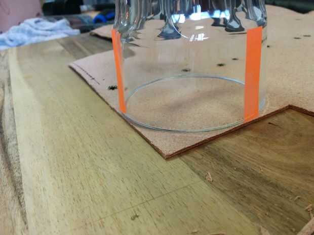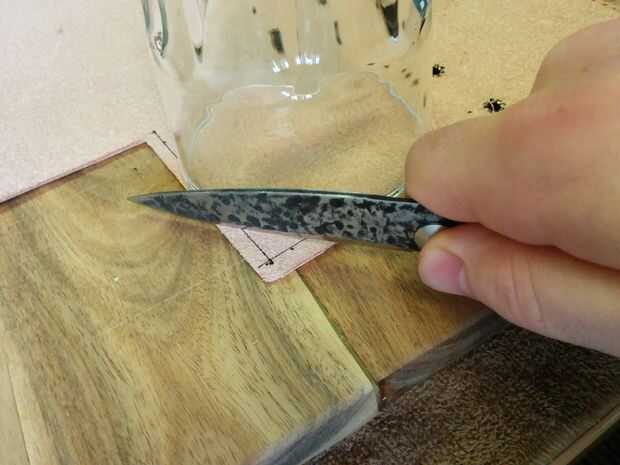 Para llegar a las esquinas perfectamente redondeos y simétricas que vamos a usar una taza/tazón de fuente de cristal como una guía cuando estamos cortando. Encontrar un vaso o recipiente que coincida con la curva de los puntos, luego con un cuchillo corta la primera esquina. Oprima el vientre de la cuchilla contra el vidrio y deslice hacia abajo en la piel. El cuchillo debe ser tangente al vidrio. Corté una serie de líneas rectas en lugar de intentar cortar un círculo.