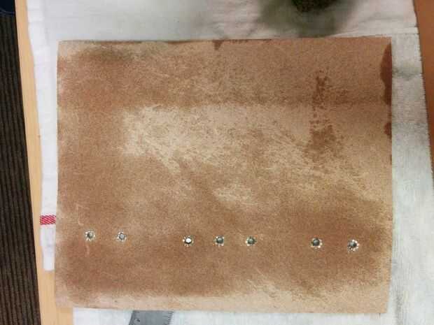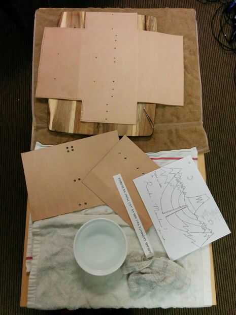 Una vez que todo el diseño ha sido trazado en la piel colocar el cuero sobre una toalla o trapo seco, y puso la corte junta en parte superior de la misma, esto le ayudará a dejar los bordes de rizar como se seca.
