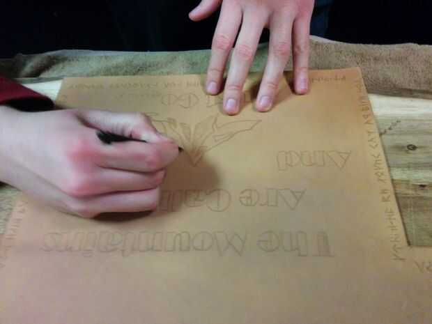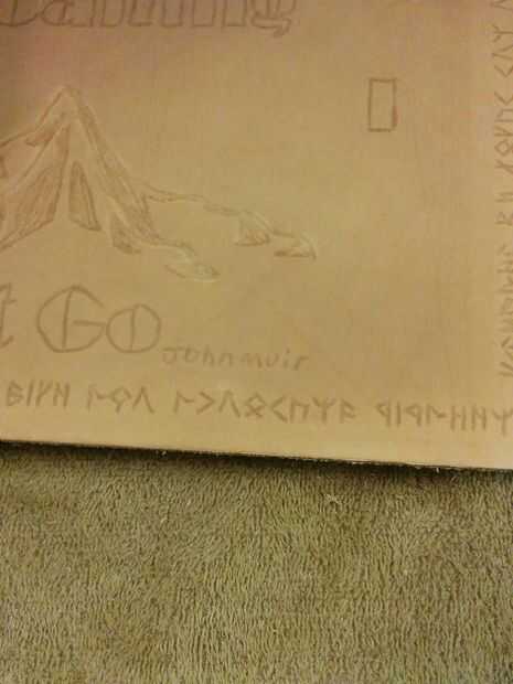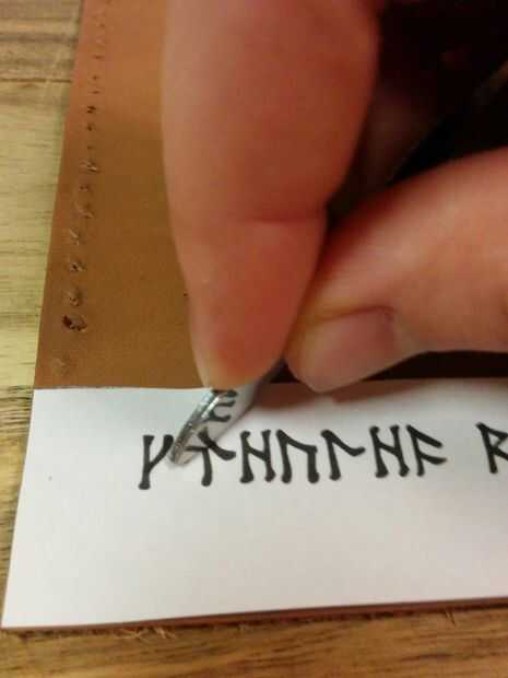 Una vez que podemos empezar a "grabar" nuestro diseño en el cuero. Coloca el papel sobre el cuero húmedo, no debe ser cualquier charcos. Luego con el lápiz táctil, lápiz, pinzas, trazar su diseño. Iniciar presionando alrededor tan duro como lo haría al escribir en un pedazo de papel. Luego revise la profundidad del grabado. Se puede entonces modificar su presión por lo tanto, si desea ser realmente profundo en el cuero y luego presione más difícil, si usted quiere que más de un tratamiento superficial prensa más suave. Su diseño todo, trate de no levantar el papel demasiado a menudo puede ser difícil de alinear.