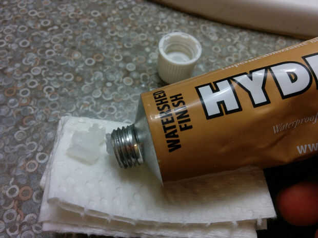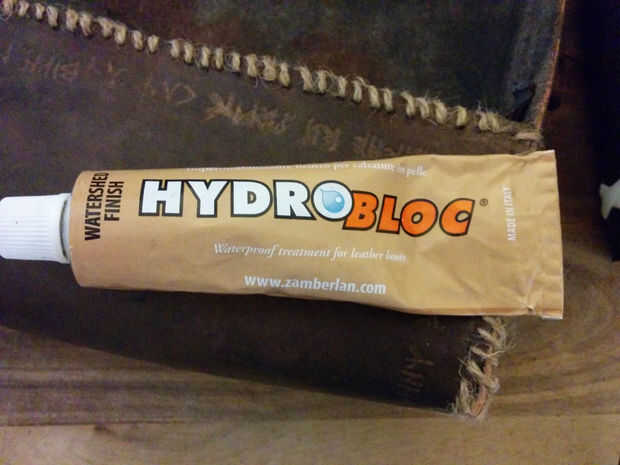 Hay un gazillion (que es el término técnico ;) maneras de tratar y acondicionar el cuero. Estoy usando un producto llamado "Hydroblock" hecha por Zamberlan. Producen botas de cuero, que es donde primero encontré este impermeabilizante. Funciona muy bien, el agua sólo grano arriba y caiga el cuero.
