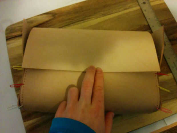 Una vez que los bordes se unen podemos obtener una buena idea de la forma del kit de afeitado. También podemos marcar en la tapa viene en relación a los lados. Porque el cuero no le gusta realmente hacer ángulos de 90 grados sobre una base regular vamos a haber cortado las esquinas los bordes altos del kit de afeitado. Manteniendo la sección de tapa cerrada marca donde la tapa curvas a lo largo de los bordes altos. Nos cortará esto más adelante.