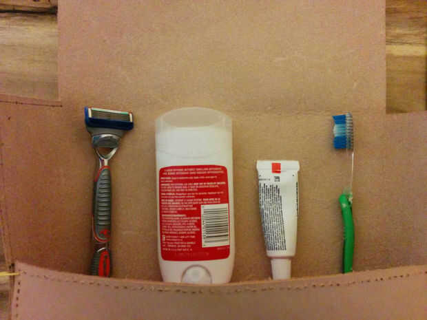 También podemos agregar una organización para el kit. Agarrar las cosas que crees que va llevar en el kit y colóquelo donde desee tener en el juego. Puse una botella de lavado de cuerpo en la parte inferior, maquinilla de afeitar, desodorante, cepillo de dientes, pasta dental, blistex y cortaúñas en los lados y el bordes, junto con un par de lugares para otras cosas que aún no he apagado. Marcar los bordes de cada uno de estos elementos, vamos a poner una anilla en cada uno de estos puntos y ejecutar el cordón elástico a través de ellos a mantener todo en su lugar.