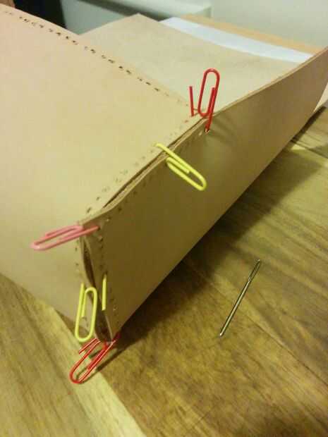 Utilizando algunos clips o alfileres, si los tienes. Temporalmente podemos juntar los bordes juntos. Poner el clip por el agujero en un extremo, luego por el agujero correspondiente en el otro borde. Hice tres clips de papel por el borde.