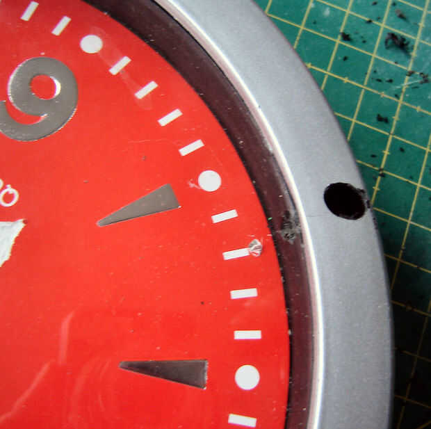 Desde la caja del reloj tiene una cubierta de cristal, necesitaba hacer una ranura para conseguir la bola en el laberinto.  Taladré un agujero en el lado de la estructura interna así como el marco exterior del reloj.  Construido poco de pegamento en los lados del agujero en el interior del marco para que la bola será dirigida a través del orificio externo y en el laberinto.