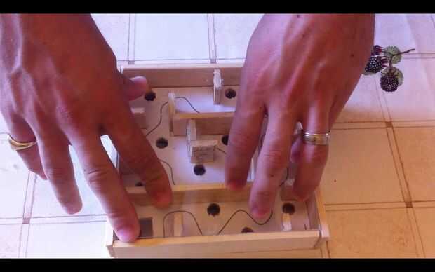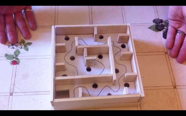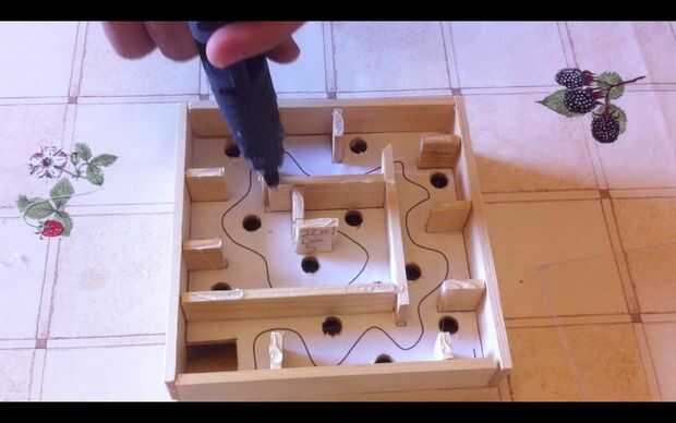 En primer lugar, decidir donde agregas el pegamento caliente para fijar la tapa. Sugieren ya sea agregar pegamento a los bordes superiores de las paredes del laberinto o añadir toques de pegamento caliente en las esquinas donde se unen los bordes del laberinto.