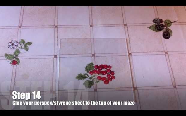 Entonces, mientras el pegamento está todavía caliente y fundido, alinee la hoja de metacrilato/estireno en la parte superior del laberinto y presione firmemente.