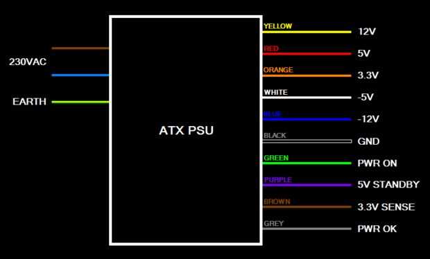 La tierra es el terreno común para cada una de las tensiones de salida. Como muestra en la imagen, el amarillo, rojo, naranja, blancos y azules cables corresponden a 12V, 5V, 3.3V,-5V y - 12V respectivamente.