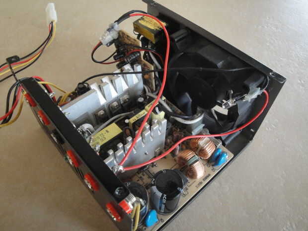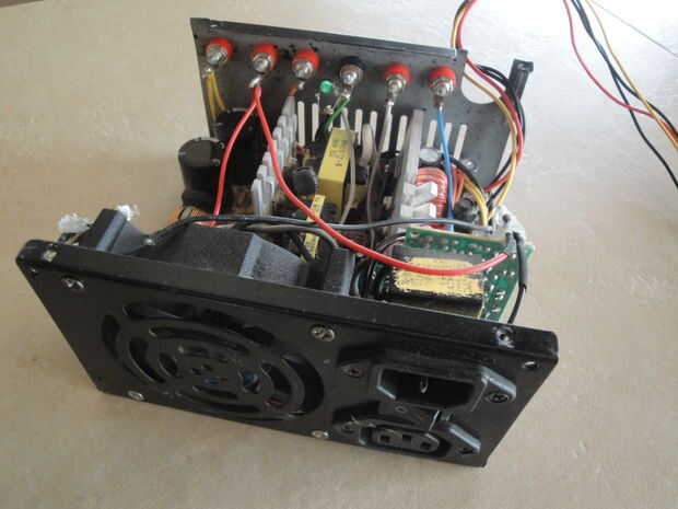 Finalmente y para las miradas, puse 2 LEDs en el interior de la fuente de alimentación conectada a la terminal de 5V (cables rojos), en serie con resistencias de 150 Ohm. Usé el terminal de 5V en vez de la terminal de PWR OK porque PWR OK es solo un indicador terminal y por eso que su producción actual es muy limitado. Aunque probablemente podría conducir 2 LEDs más.