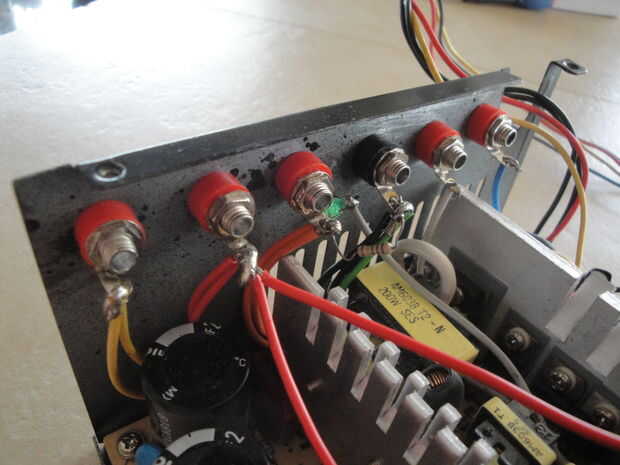 Aquí están las conexiones a los terminales. Dejé más de un cable en algunos terminales para que puedan utilizar más actual. Las especificaciones de potencia para cada salida es distinta y puede encontrarlo en la carcasa de la fuente de alimentación, pero para usar correctamente debe salir más alambres en paralelo. De lo contrario, dependiendo de la aplicación por supuesto, podría alcanzar el límite de corriente del cable, y la caída de tensión también aumentaría. También cortó todos los cables que no necesito.