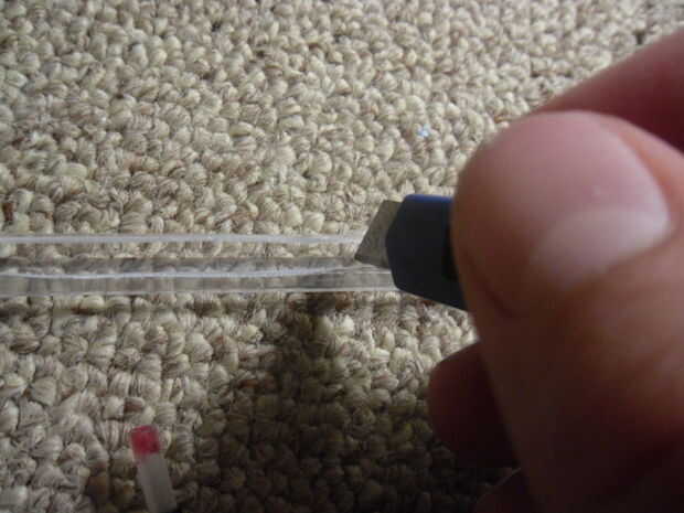 -Utilizando la hoja de afeitar corta desde la parte superior (el extremo que no corte) de la pieza de la vivienda claro a donde marcaste para que hacer una pista para el perno. Es imperativo que usted corte a este fin