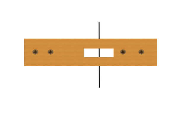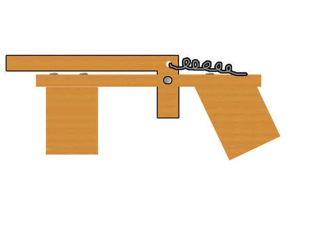 Ahora voltear el marco desde el paso 1 para que usted puede hacer un agujero cuadrado de 1 cm de ancho y 4 cm de largo en el centro de la placa superior. (Usé una dremel para cortar, pero puede usar lo que quieras). Luego perfore un agujero a lo largo de la línea negra (bajo). Luego poner el mecanismo de disparo en canal paso 2 el agujero y ejecutar un clavo o una barra de metal a través del orificio que ha perforado y a través del segundo agujero en el mecanismo del gatillo. Luego enganchar el resorte a la cabeza del tornillo trasero y el primer agujero.