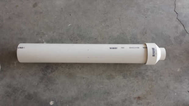 Este es el tubo de diámetro de 3" con el 3" a 1.5" reductor en él. Esto será donde se recoge el spray de pelo u otra fuente de combustible. Para crear esta parte principal uno de los extremos de la tubería de PVC de diámetro de 3" y déjelo secar durante aproximadamente un minuto. Una vez preparado el cemento se aplica con el mismo fin. Por último diapositiva 3" a 1.5" reductor hasta el final preparado y cementado. Al cebar el otro extremo de la tubería de 3" de diámetro. Una vez preparado otra vez cemento este fin. Una vez que se prepara el otro extremo Coloque el tapón de rosca de 3" PVC. Una vez que ambos extremos de la tubería de 3" han tenido el reductor y la tapón deje conectado el cemento seco.