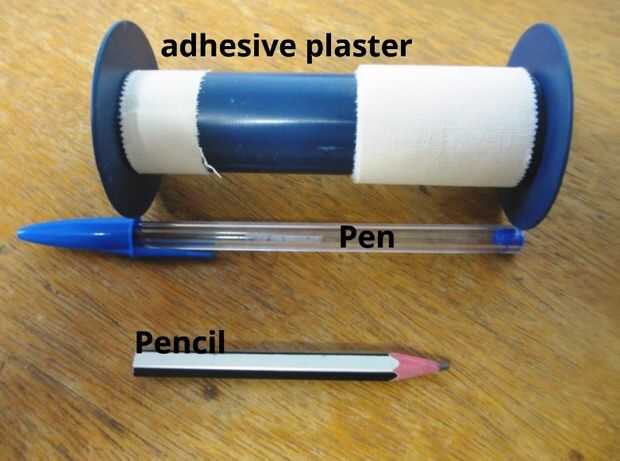 Un bolígrafo (preferiblemente pasada por la mitad), un pequeño lápiz y un poco de esparadrapo (u otro tipo de cinta adhesiva)