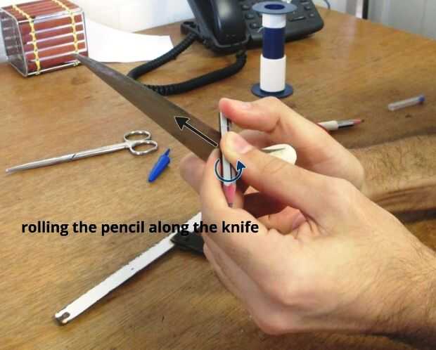Con un cuchillo, rodar el lápiz a lo largo de él para marcar y delimitar el lugar para cortar (es muy importante hacer este paso, ya que necesitamos cortar y recortar con cuidado, evitando una superficie irregular y asimétrica). Recomiendo hacer un taco ni tan grande ni tan pequeño. Accidente si tan grande y no fije bien si tan pequeño