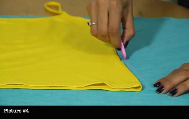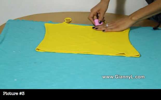 Cuadro #2: Con la ayuda de una tapa (camisa), coloque en la parte superior. Esto le ayudará a dibujar la forma del vestido.