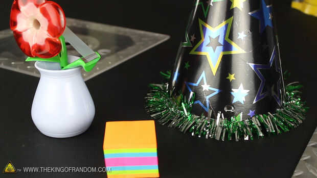 Iniciar este proyecto con un rollo de cinta scotch, un montón de papelitos y un sombrero de fiesta de papel.
