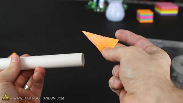 Con pequeños cuadrados de 2 x 2, envolver cuidadosamente alrededor de la punta del sombrero. La forma de cono actúa como una guía de formación para la fabricación de un dardo de papel puntiagudo.