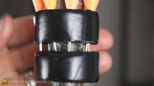 8 agujeros hiciste espacio uniformemente los dardos y guía las uñas mientras que empujan hacia abajo en el acolchado abajo. Estas aljabas improvisados mantienen todos los dardos firmemente en su lugar, al tiempo que protege las puntas de los dardos al mismo tiempo.