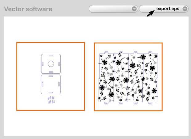 I descargar las plantillas desde el sitio y había arreglado mis partes de la lámpara en ellos. Necesito 2 archivos como voy a usar 2 materiales diferentes. Me aseguré que los grosores de línea y los colores son como especifica en la que hace de guía y luego exportación mis archivos como un EPS.