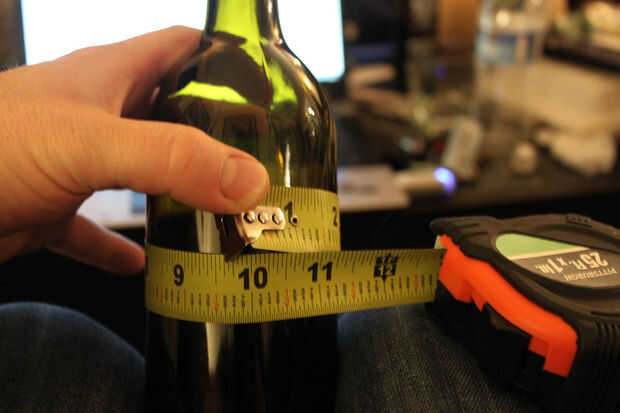 Primero deberá medir el diámetro de su botella de vino. Hacerlo utilizando alguna cinta métrica envolviéndolo alrededor de la botella hasta que se superpone a sí mismo. Tome nota de esta medida. Usted también necesitará medir la altura total de la botella, así como la distancia desde la parte inferior de la botella hasta donde empieza a taper off en el cuello de la botella. Esta distancia es necesaria saber porque el grabador del laser requiere una distancia fija para que funcione correctamente. Como el láser se mueve hacia el cuello se convierte fuera de foco y no se graba el vidrio, distorsionando su diseño. Con estas medidas abierto un dibujo con las dimensiones de tamaño de tela iguales al diámetro de la botella como la anchura y la altura total de la botella como la altura. Marca de la región superior del plano donde comienza el cuello afilado como una "zona no empate" y mantenerlo en blanco.