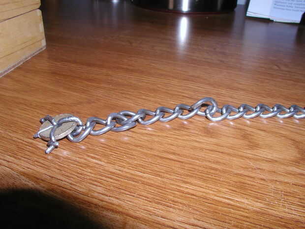 Ahora, toma el resto de su cadena y coloque con el link abierto sobre la cabeza del mayal, ahora simplemente sqweeze el enlace abierto cerrado todo el eslabón que usted a puesto en él. ahora debe tener una longitud de cadena con la cabeza de mayal atada a un extremo, se verá algo como la imagen de abajo.