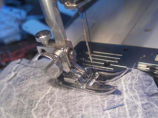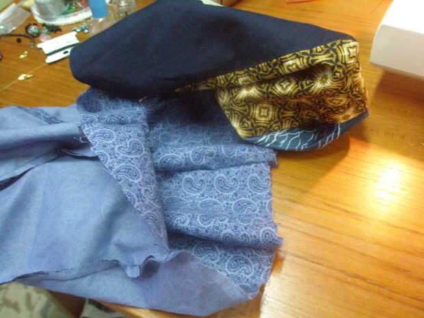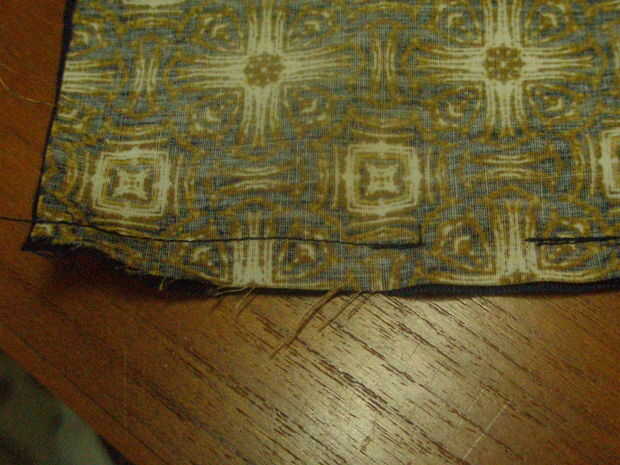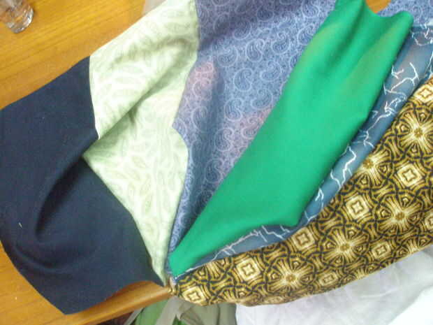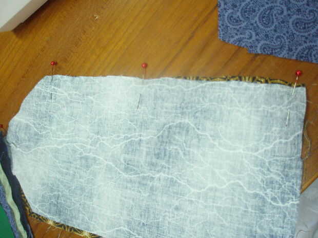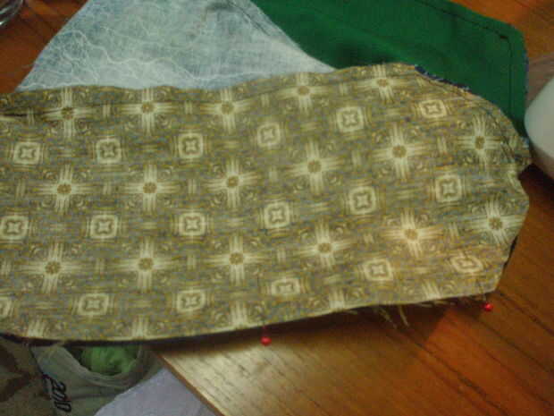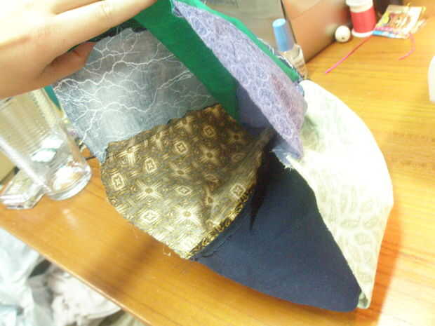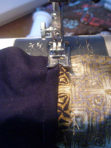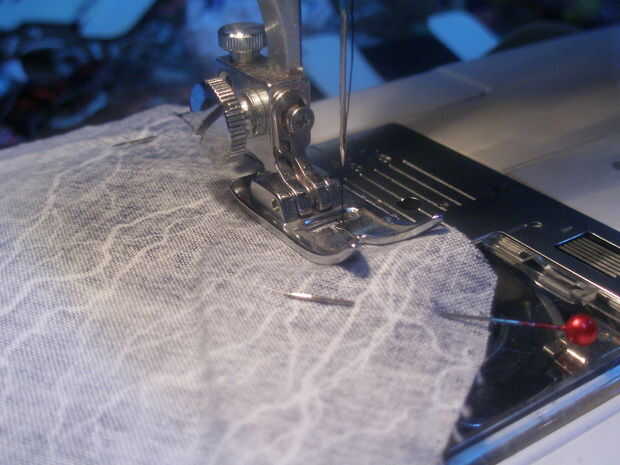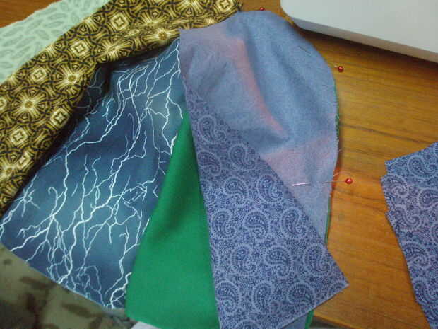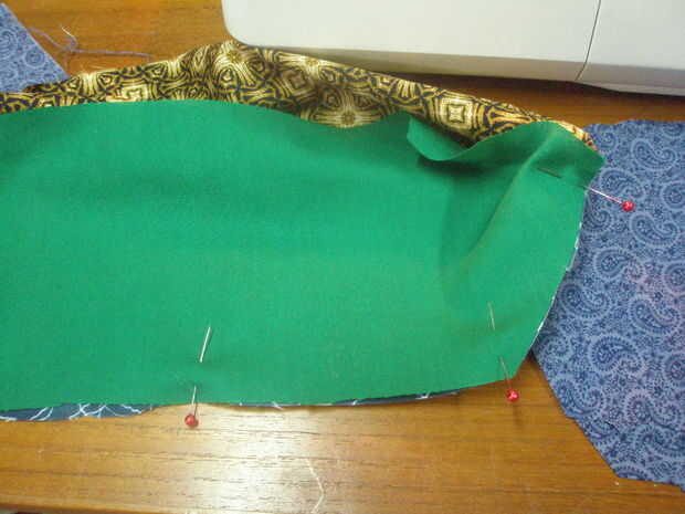 Ahora empieza la costura! Una vez que el arreglo que desea, pin juntos dos piezas derecho con derecho y coser un lado juntos desde el punto de fondo en la parte superior. Yo sobre el margen de costura de 1/2 pulgadas pero es depende de ti, sólo que tenlo en cuenta al hacer el patrón y cortar piezas. Abrirlos y pin y coser la pieza siguiente. Continuar agregando piezas hasta tener 6 conectado y solo tienes que conectar los lados. Cuando se conecta el lado pasado, deje aproximadamente una media pulgada de apertura unas 3 pulgadas desde el borde. Esto es donde el lazo irá más adelante. Hacer esto a ambos lados.