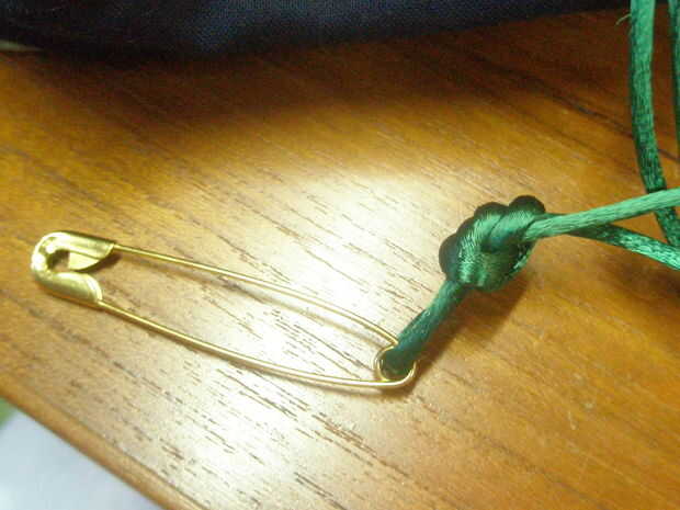 a partir de la apertura para el perno del lazo en las costuras alrededor de la bolsa para mantener las capas en lugar de molestarse y coser dos costuras alrededor de 1/2 pulgada aparte todo el camino alrededor de la bolsa.  Corte una longitud de cable y atarla a un perno de seguridad y alimentos a través del canal que solo cosido.  Si lo desea, puede Agregar un grano o un encanto hasta el final de la cuerda.
