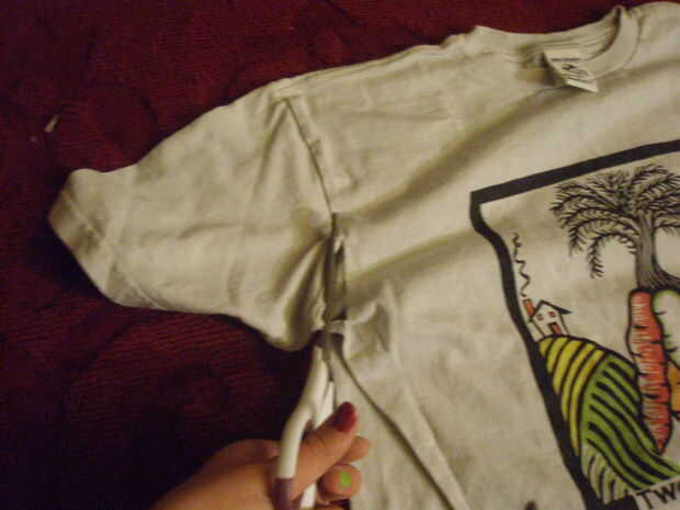 Todo lo que necesitas es una camiseta no deseada, tijeras y a 30 minutos.Paso 1: Pone la camiseta de su selección sobre una superficie plana. Inicio y apagado cortando el dobladillo (la parte inferior de la camisa).Paso 2: Principio en la parte infer