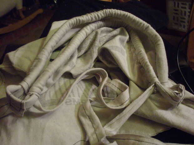 Usando un perno de seguridad conectado a uno de los tirantes, la alimentación a través de un lado y luego el otro. Tire de él hasta que esté incluso y repita con la otra correa. El debe ahora ser un bucle formado por las correas en cualquier lado y dos correas de largo a cada lado.