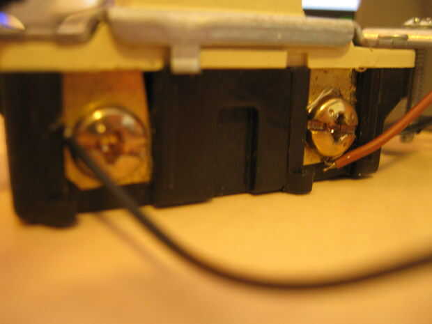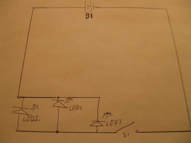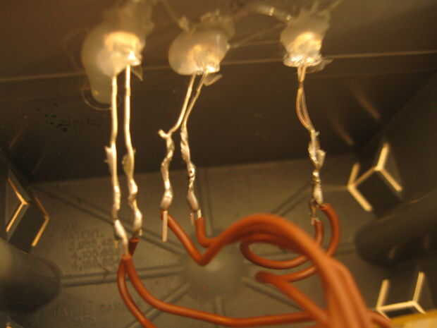 Alambre todos los LEDs en paralelo y el interruptor y la batería en serie.  Soldar los cables a los cables de los LEDs que hacen agujeros inclinados en el lado de la caja eléctrica.  Pegar los LEDs a través de estos agujeros y fijar con pegamento caliente.  doble las puntas hacia abajo para hacer espacio para el interruptor.