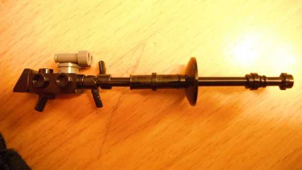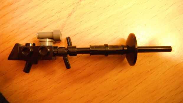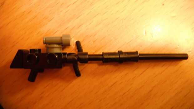 Para la segunda parte del cañón, primero Conecte la otra varilla para el lado abierto de la clavija. A continuación, deslice la pieza de disco en la varilla para que el perno quede mirando el cuerpo. Por último, conectar la empuñadura del sable de luz al final de la barra, y listo el francotirador!