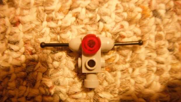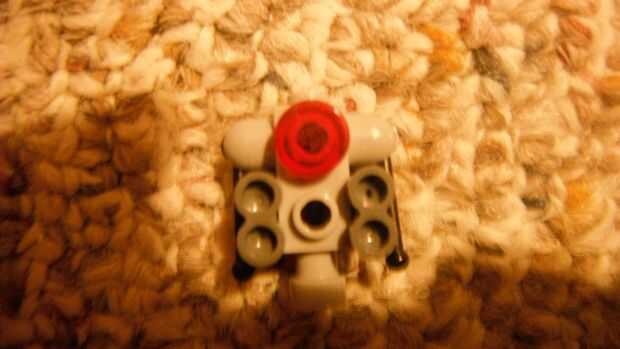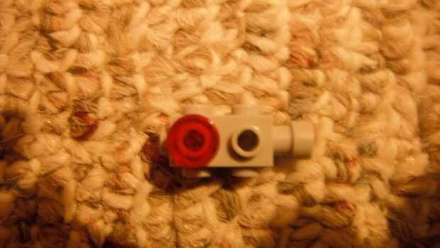 Fije el perno sin un poste a la "cámara" como se muestra. Luego, coloque las palancas de mando como se muestra. Estos servirán como el "ojo" y los brazos, respectivamente. Ahora, fije los prismáticos a los postes debajo de los brazos, que se asemejan a luces de discoteca láser.