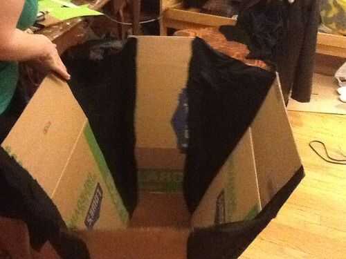 una vez finalizado, cortar triángulos largos de la tela negra y pegar dentro de la costura de la falda. (Recuerde que el gordo fin del triángulo está en la parte inferior) ** en este cuadro, la falda está al revés mostrar cómo los triángulos se pegan (Foto 3)