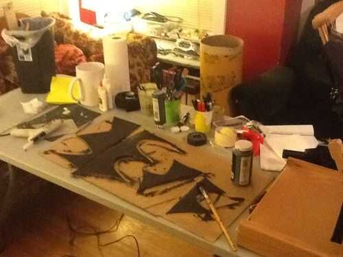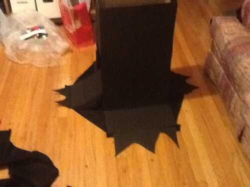 tomamos un cartón, recortar los bordes para colgar de la parte inferior de la falda para darle un aspecto de resecarse. Sujete por la tela para que se muevan un poco.